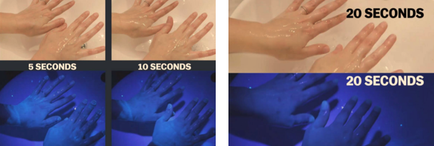 至少洗超過 20 秒,婦產科名醫鄭丞傑教授在臉書上分享一則影片,講明了為什麼用肥皂洗手至少 20 秒才有效,實驗中使用了特殊乳液『在紫光燈照射下會呈現螢光』作為細菌。第一次先使用清水洗手,然後又在紫光燈照射下,會發現雙手仍有螢光色,又測試了用肥皂洗了 5 秒跟 10 秒手的差別,還是發現雙手的螢光顏料仍未被洗掉,最後一次是試驗用肥皂洗手 20 秒,才將手上的螢光顏料給洗掉!( 如下圖 )
