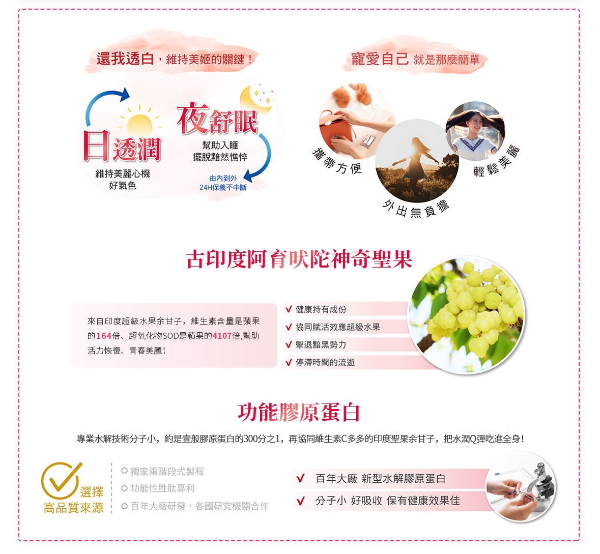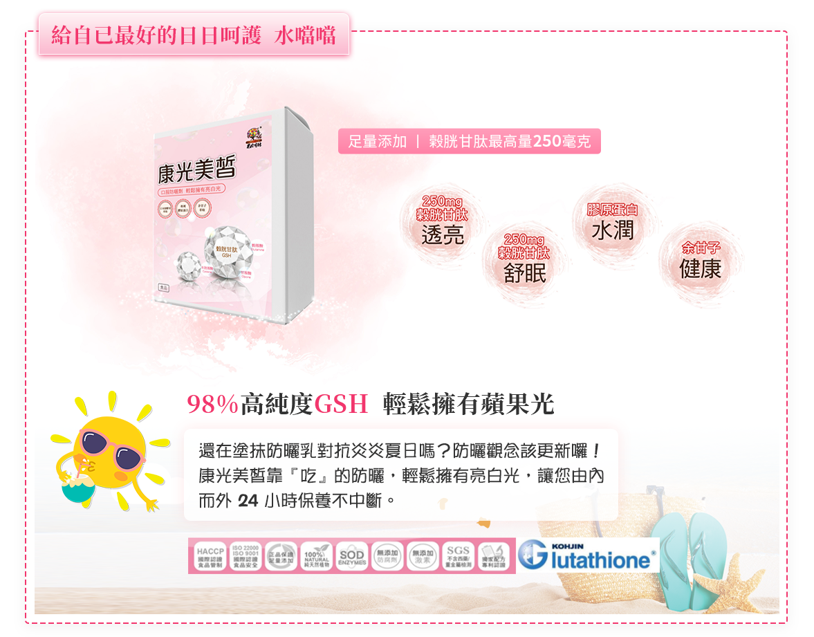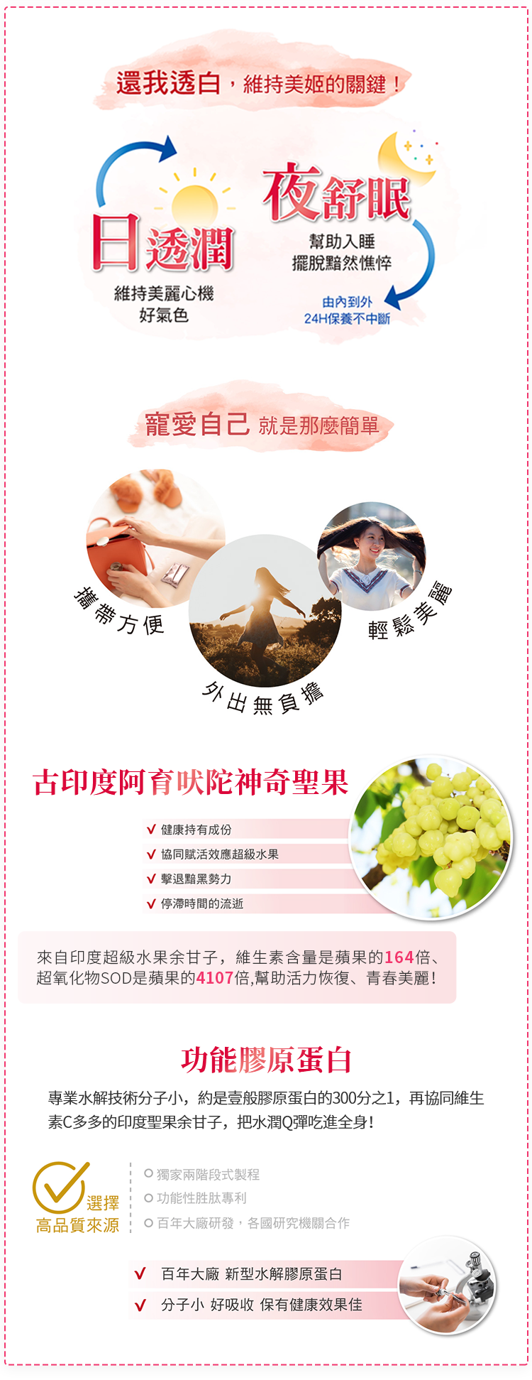 穀胱甘肽(GSH 三大作用,入眠、代謝、養顏 ,一包滿足一天建議的食用量 。 複合添加專利膠原蛋白、余甘子萃取與柑橘類黃酮,原料從源頭即開始把關,提升機能添加時的精確度。