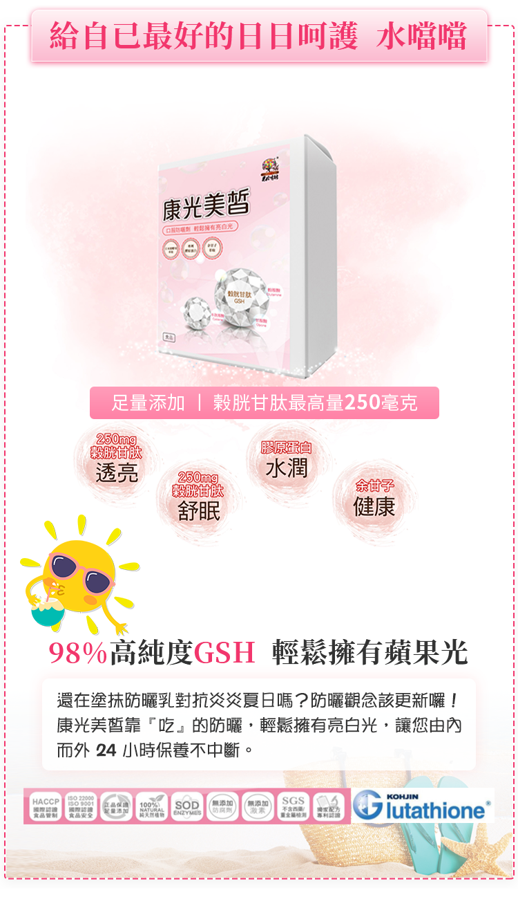 3. 衛福部針對穀胱甘肽建議每天食用限量 250 毫克 以下(本產品至多 1 包),多食無益 。