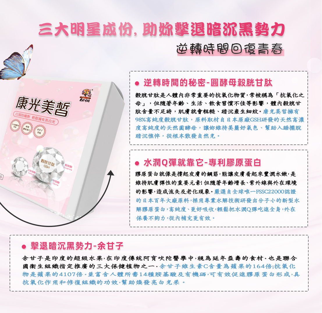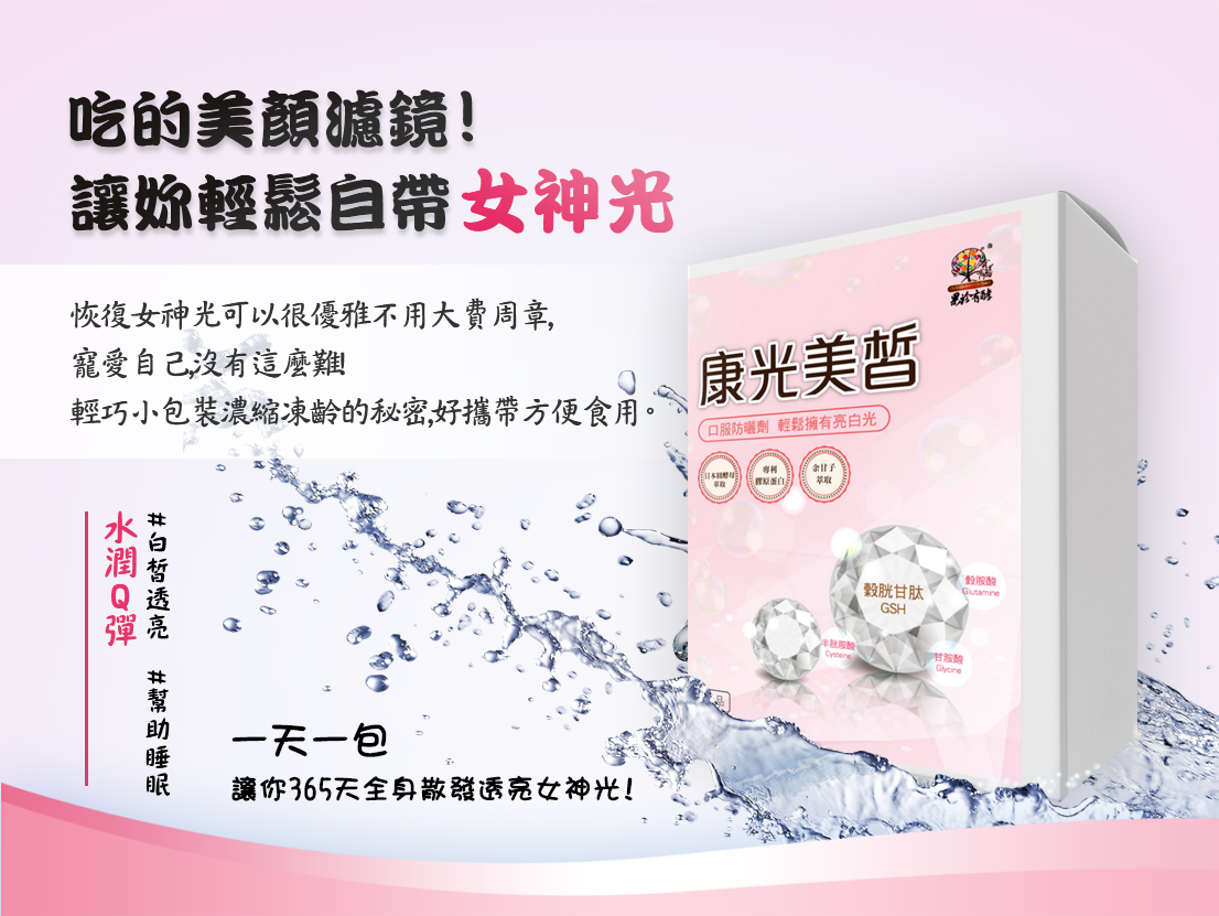 穀胱甘肽(GSH 三大作用,入眠、代謝、養顏 ,一包滿足一天建議的食用量 。 複合添加專利膠原蛋白、余甘子萃取與柑橘類黃酮,原料從源頭即開始把關,提升機能添加時的精確度。