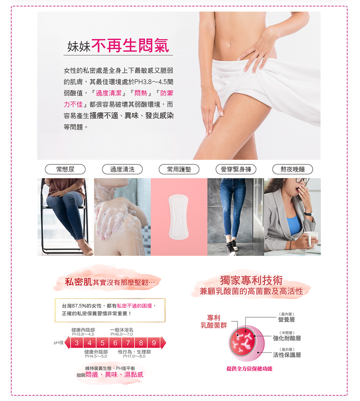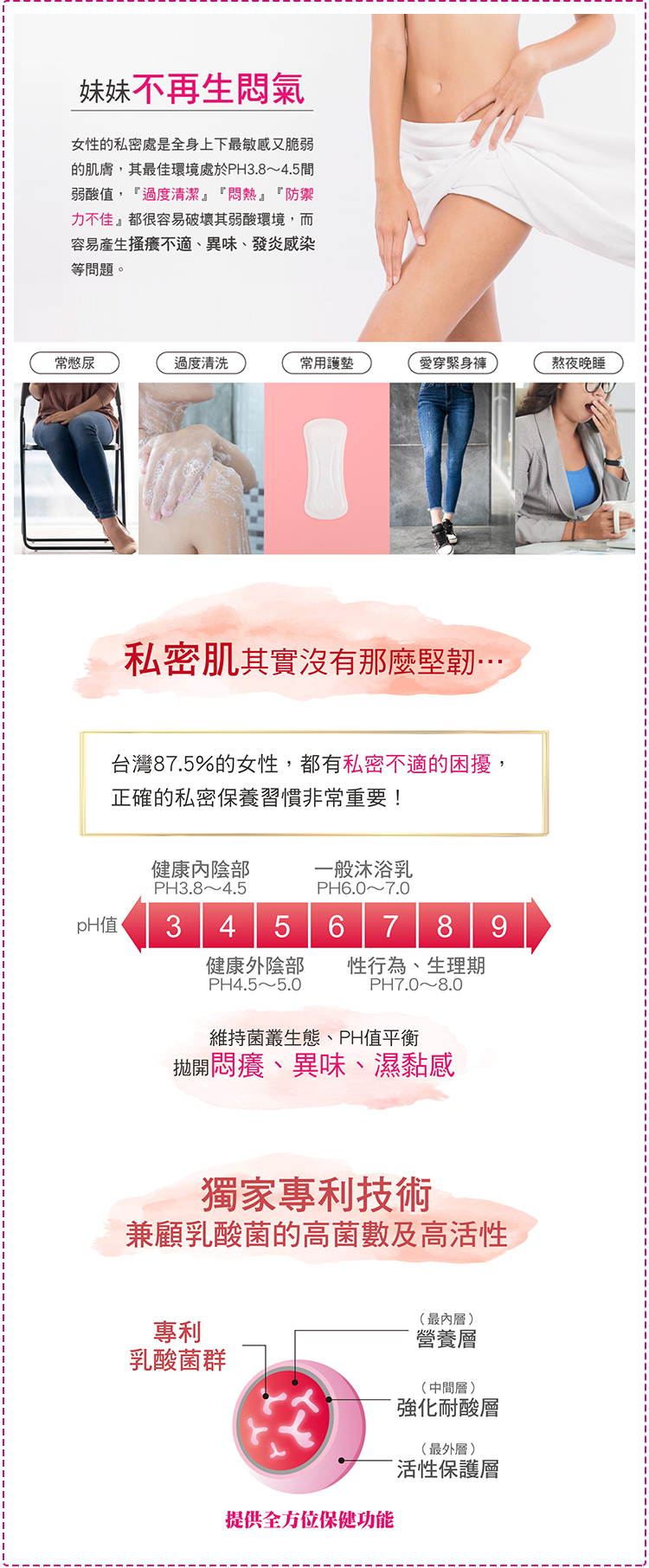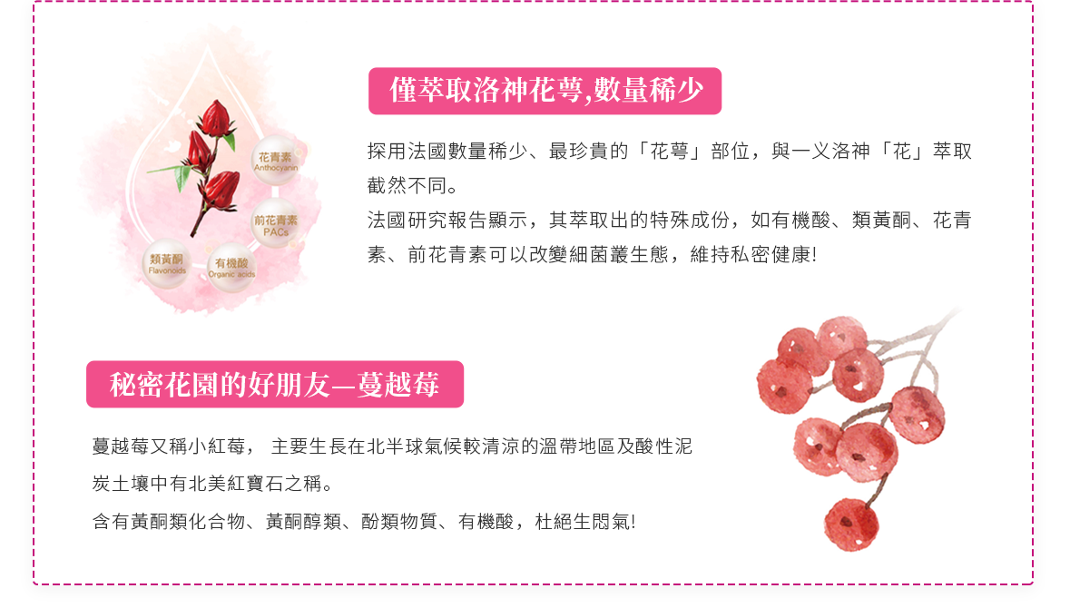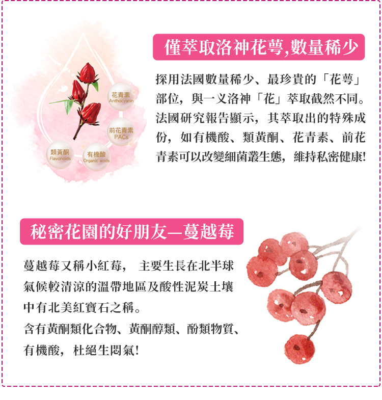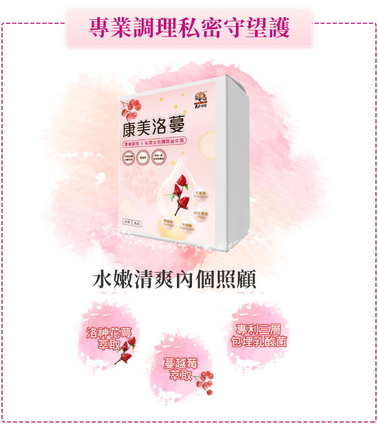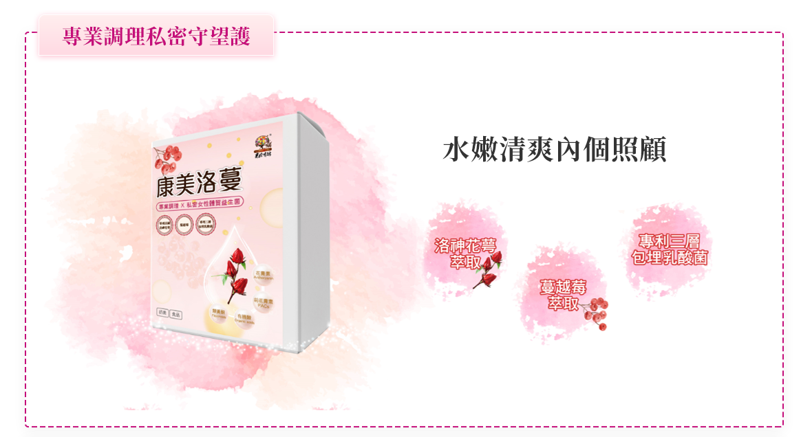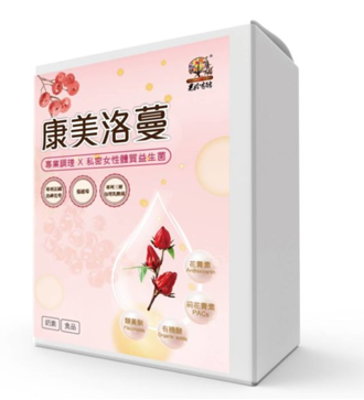 | 成份 | 乳糖、專利法國洛神花萼萃取物、 蔓越莓萃取物(蔓越莓萃取物、麥芽糊精、玉米澱粉、葵花卵磷脂)、專利三層包埋乳酸菌(麥芽糊精、乾酪乳 桿菌( Lactobacillus casei )、羅伊氏乳桿菌 Lactobacillus reuteri )、鼠李糖乳桿菌( Lactobacillus rhamnosus 。 |