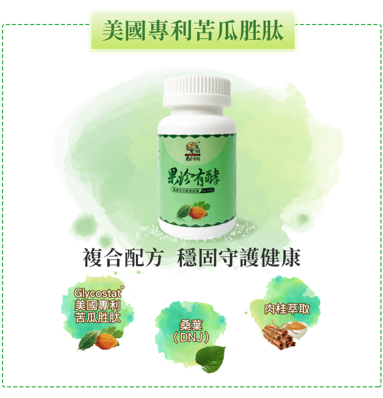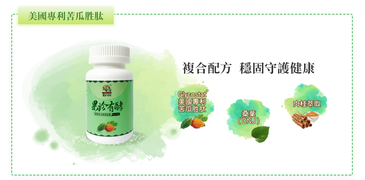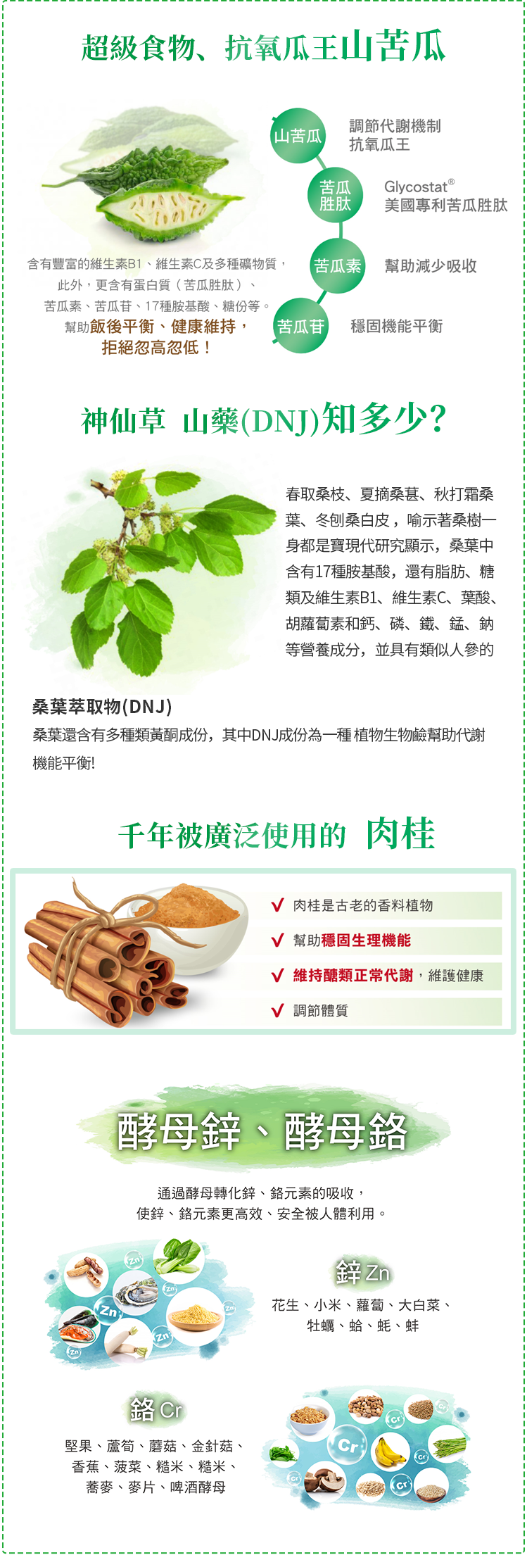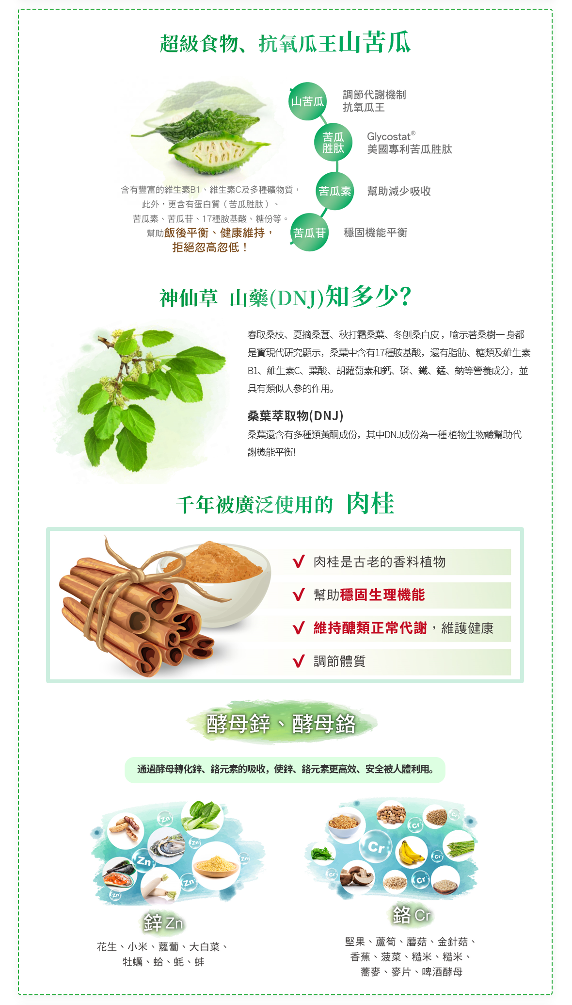 嚴選複合配方,採用擁有美國專利的苦瓜胜肽,並結合桑葉、肉桂、鋅鉻酵母與鳳梨酵素,穩固守護健康,調節生理機能,維持醣類正常代謝 。