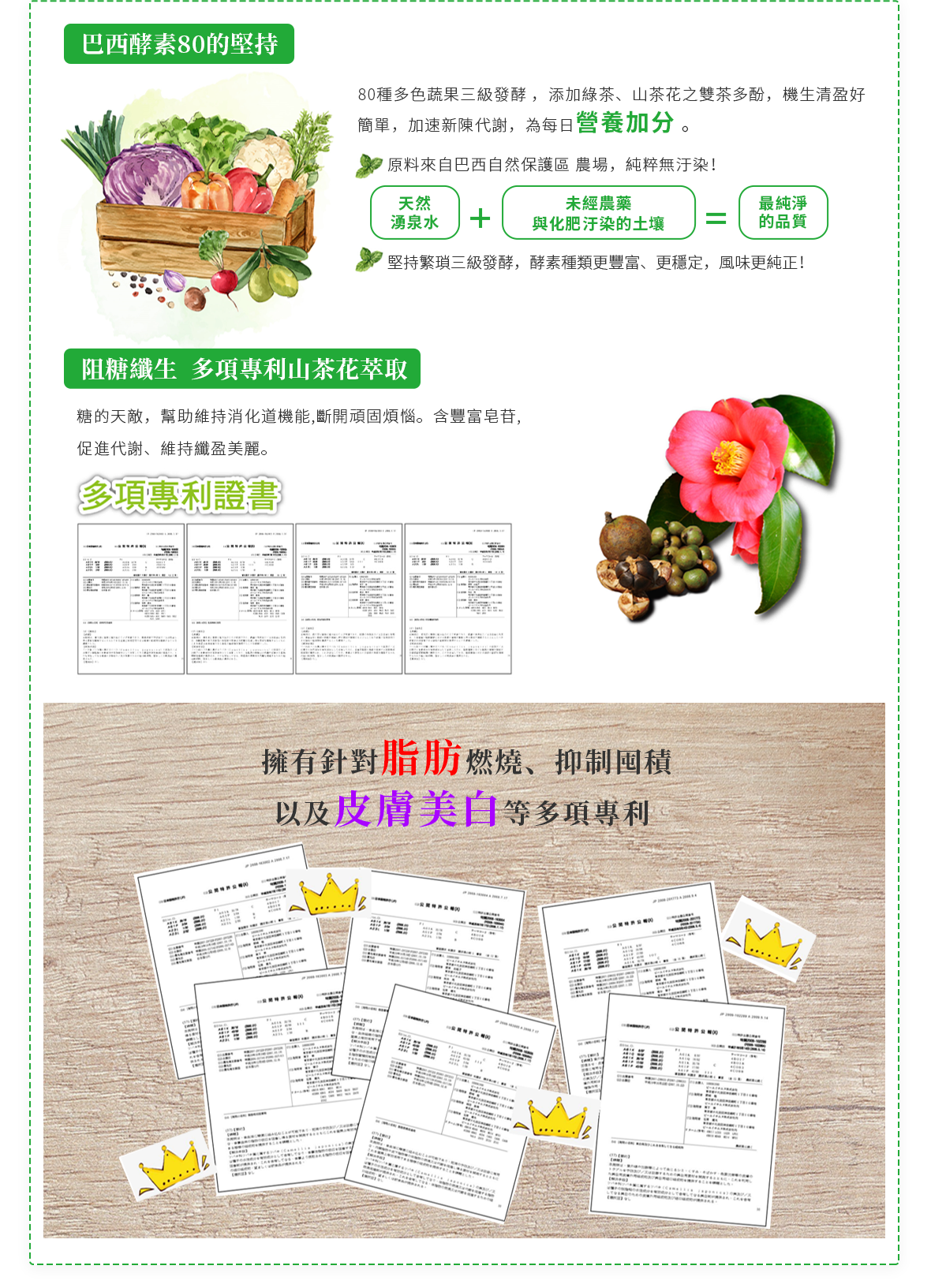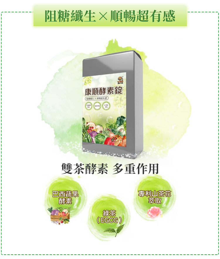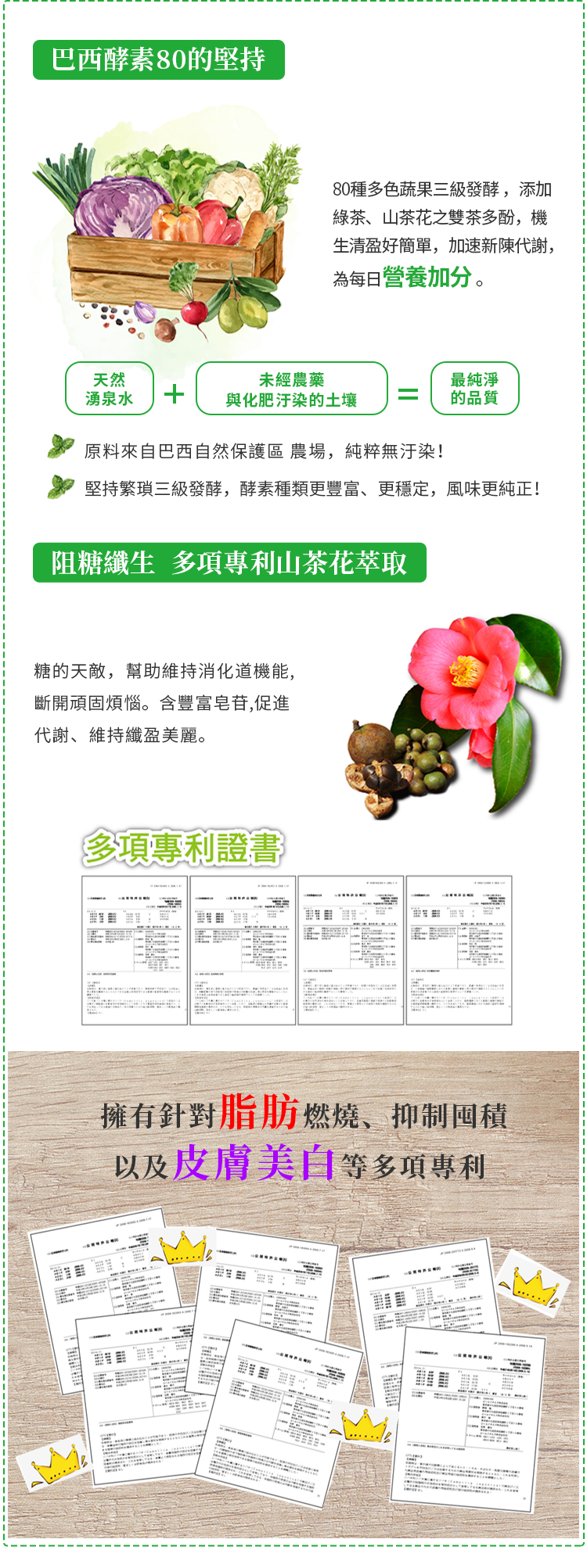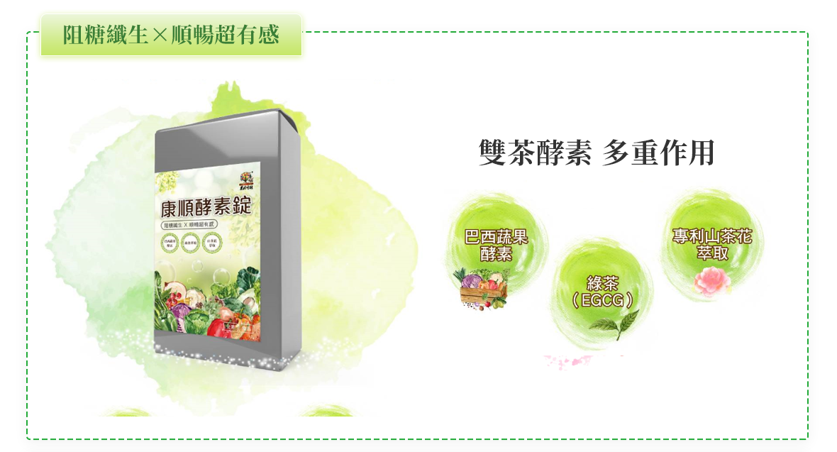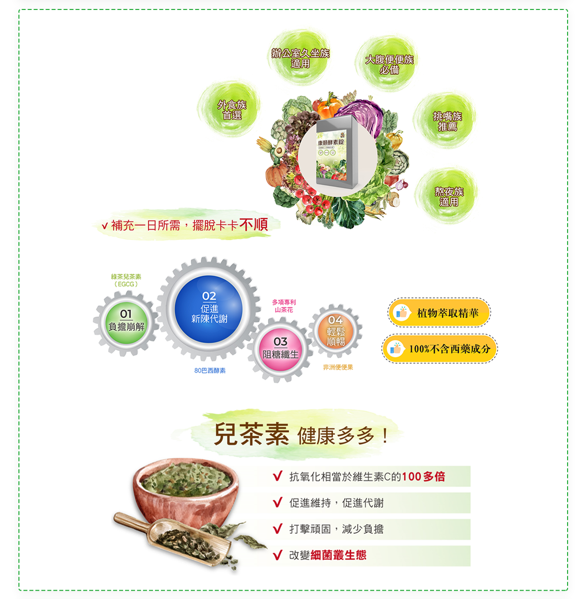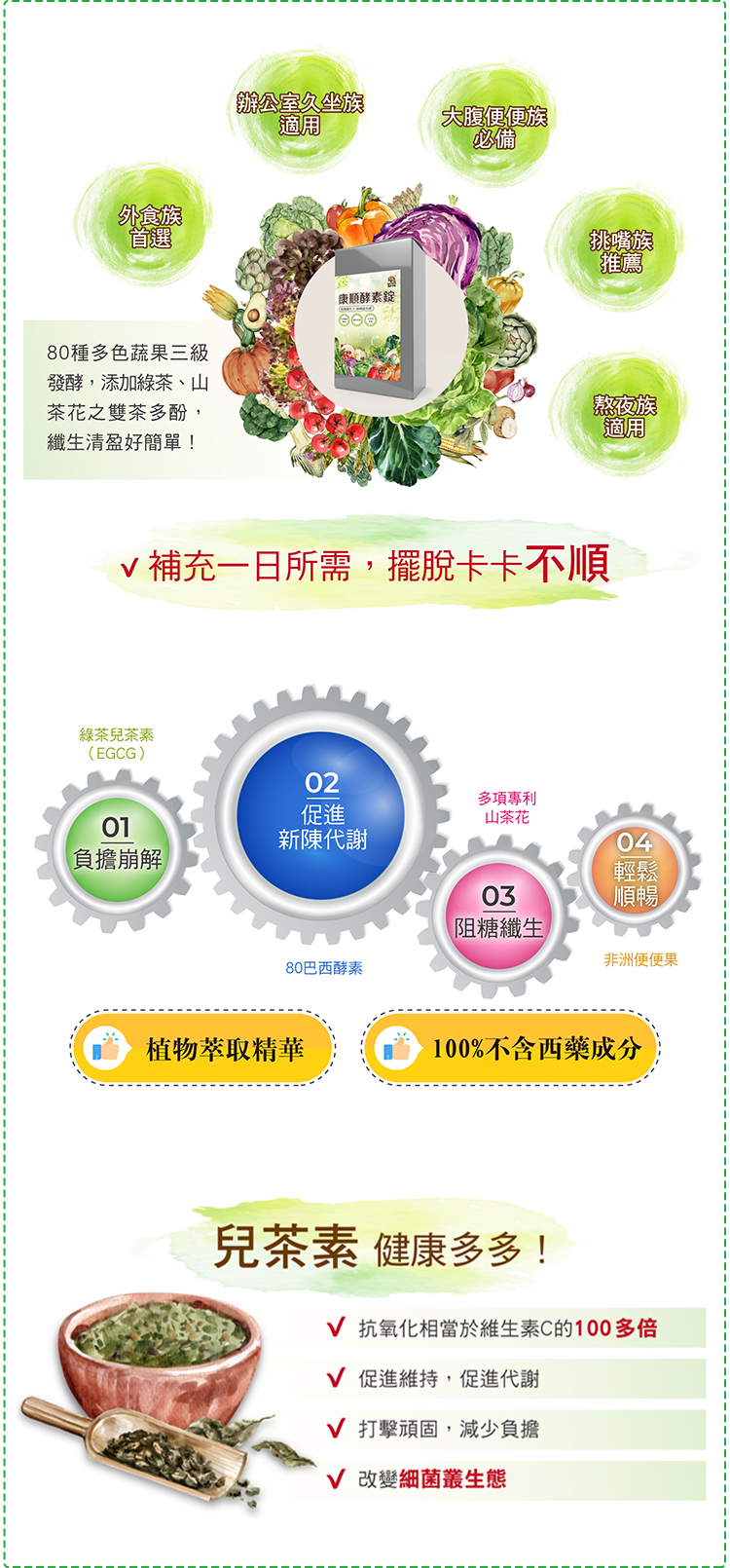 | 成份 | 麥芽糊精、綠茶萃取物、臘腸樹、山茶花萃取物、螺旋藻、巴西綜合蔬果萃取物( 昆布、裙帶菜、紫菜、香菇、檸檬馬鞭草、苦艾、西番蓮、金盞草、 大飛揚草、牛筋草、檸檬草、大茴香、馬黛茶、甜菊、瓜拿那、薰衣草、貓薄荷、貓爪藤、肉桂、生薑、薏仁、益母草、絞股藍、七葉膽、丁香、鬱金 莪朮、咸豐草、蓮藕、牛蒡、迷迭香、燕麥片、玉米、大麥、豌豆、紅豆、亞洛豆、巴西紫豆、芝麻、小米、大豆、爆裂玉米、黑麥、黑豆、鷹嘴豆、 雞豆子、扁豆、糙米、鳳梨、香蕉、蘋果、木瓜、芭樂、甜瓜、哈密瓜、酪梨、梅子、西印度櫻桃、檸檬、葡萄乾、芒果、楊桃、西瓜、腰果、巴西堅 果、山刺番荔枝、奇異果、西洋梨、古布阿蘇樹果、巴西莓、卡 姆果、柳橙、蘿蔔、高麗菜、菊苣、甘藷、南瓜、木薯、番茄、羽衣甘藍、青椒、紅甜 菜、胡蘿蔔、長南瓜 、二氧化矽、聚乙烯吡咯烷酮、硬脂酸鎂 。 |